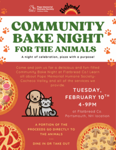 Join us for a delicious and fun-filled Community Bake Night at Flatbread Co.! Stop by to learn more about Pope Memorial Humane Society–Cocheco Valley and the many ways we support animals and our community.