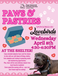Join us on Wednesday, April 8th at the shelter for an open house event, sponsored by Lovebirds!