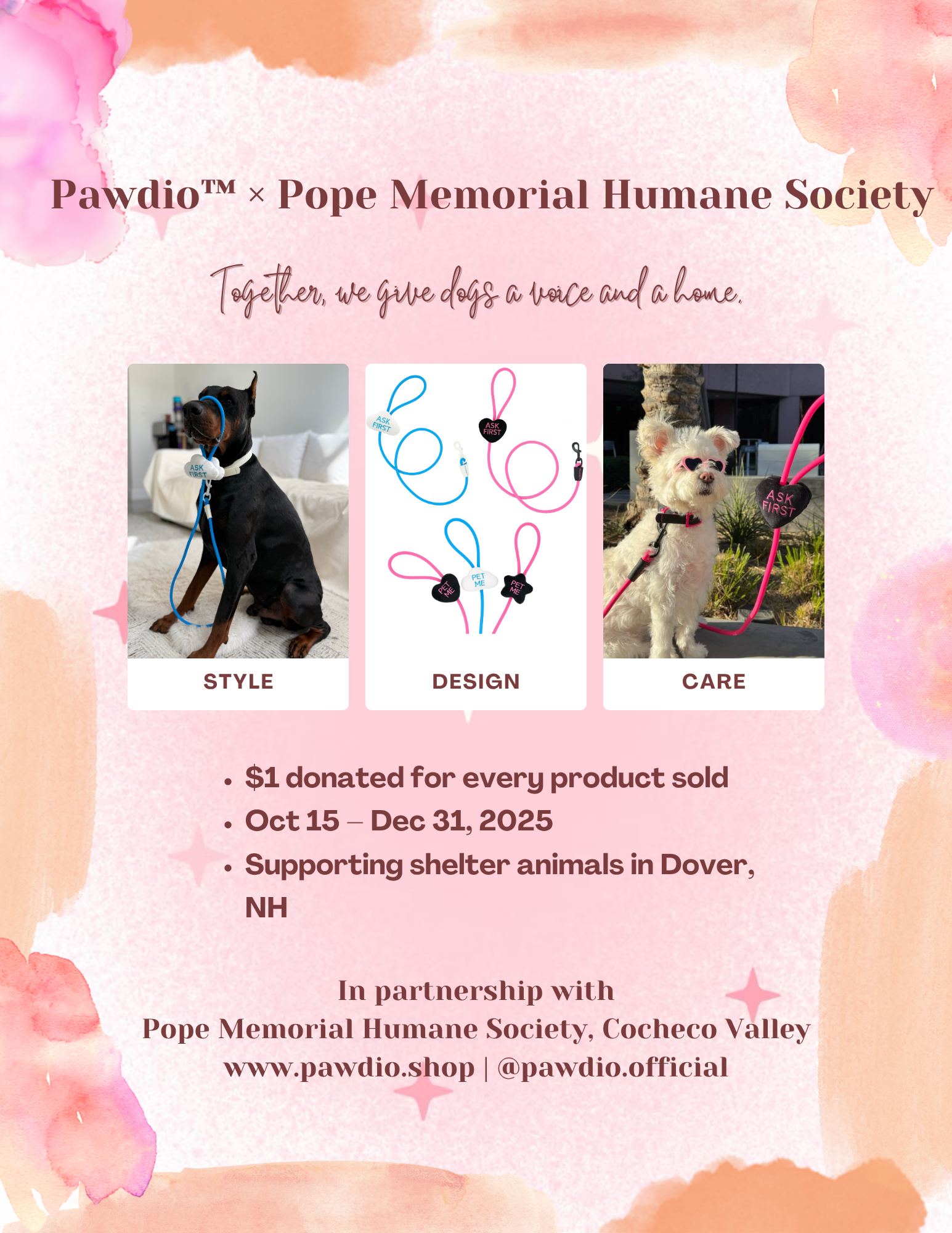 "Every Leash Gives Back" Holiday Season Donation Partnership with PAWDIO. From October 15th-December 31st, PAWDIO is donating $1 for every PAWDIO leash or collar sold. Check out their website here: PAWDIO | PAW STUDIO| Stylish Dog Collars, Leashes & Pet Accessories – Pawdio