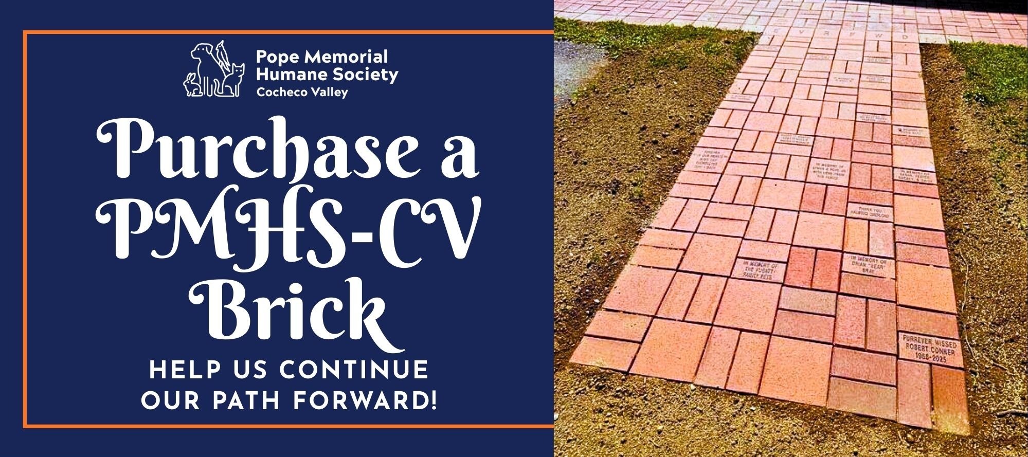 Leave a lasting mark on the shelter you love by purchasing an engraved brick for our walkway. Honor a beloved pet, celebrate your family, or showcase your business while helping provide care, enrichment, and second chances to more than 1,000 animals each year. Each brick is a permanent reminder that this community makes our path forward possible—one step, and one life, at a time!